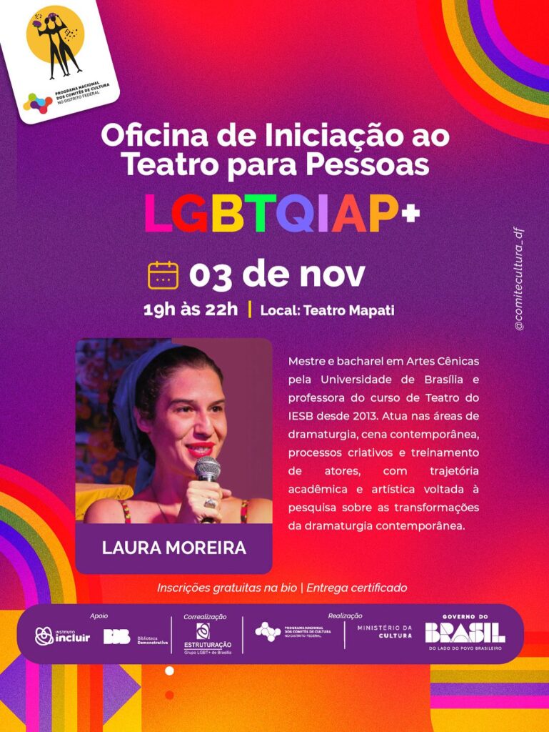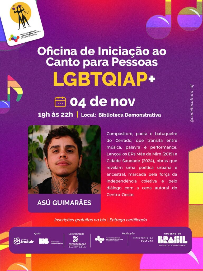 O Programa Nacional de Comitês de Cultura (PNCC), do Ministério da Cultura, com realização do Comitê de Cultura do Distrito Federal e parceria do Grupo Estruturação, anuncia duas oficinas gratuitas e formativas voltadas para pessoas LGBTQIAP+ interessadas em desenvolver suas expressões artísticas por meio do canto e do teatro.